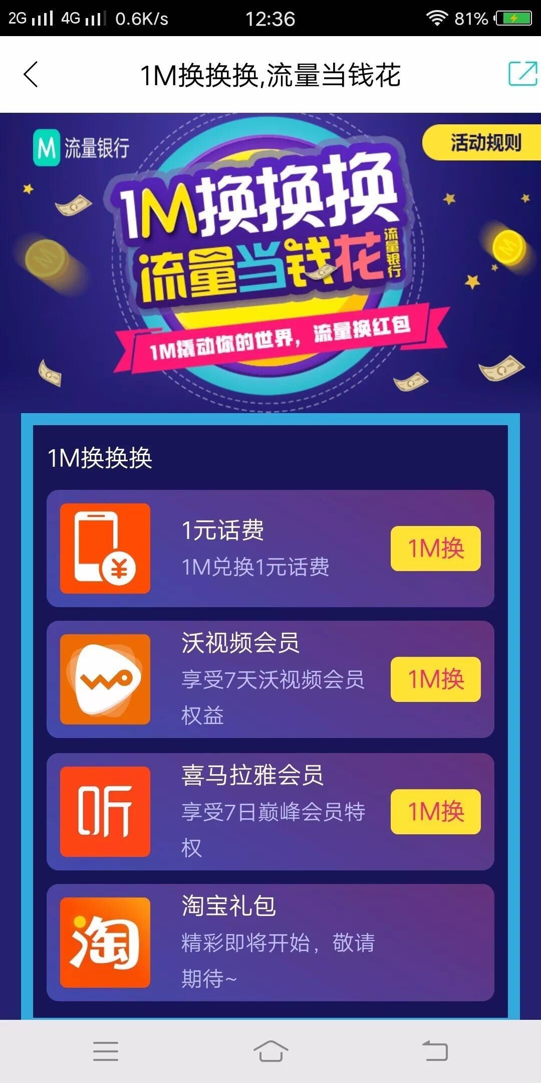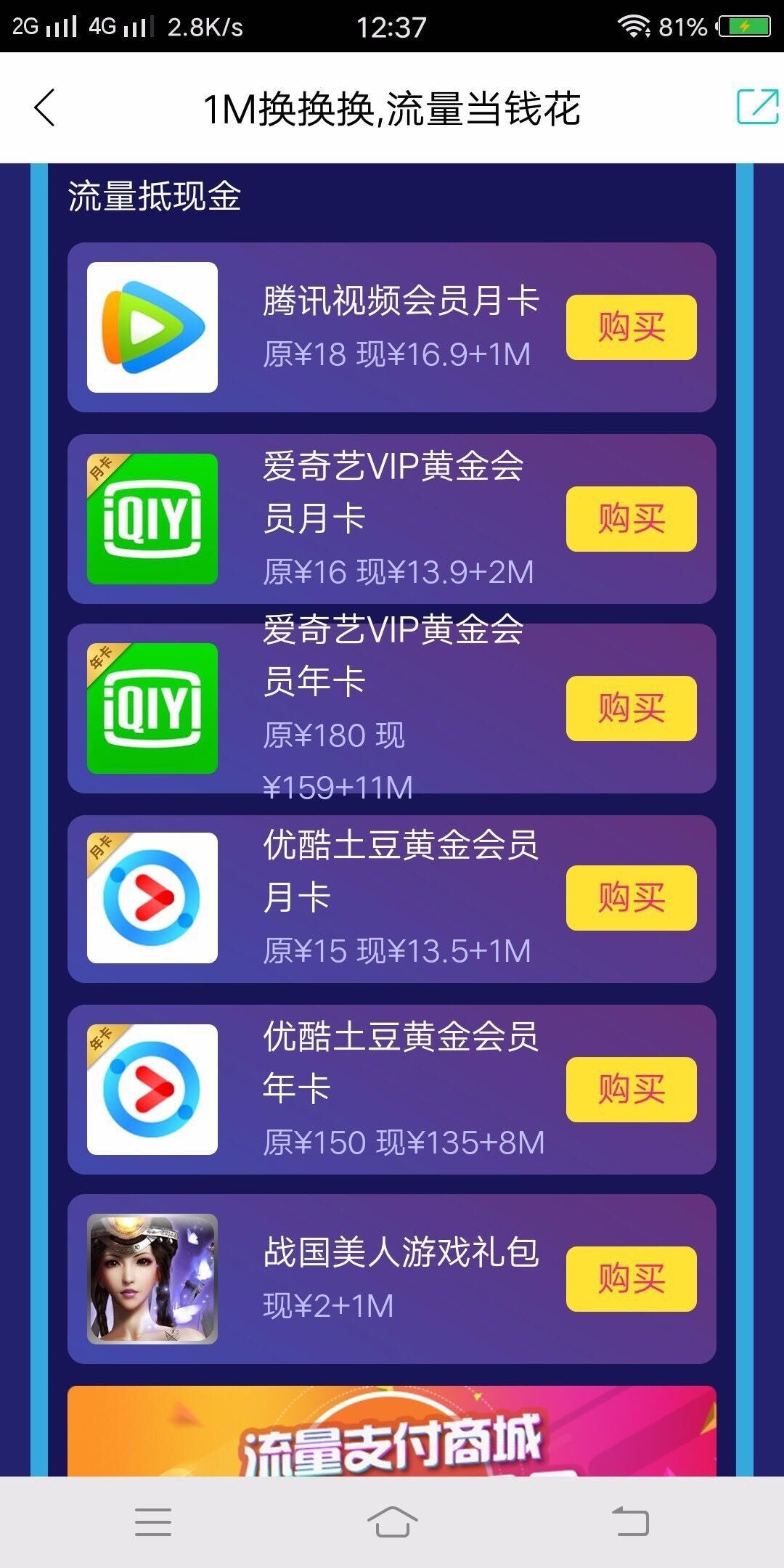 用户在支付腾讯视频会员、爱奇艺会员、优酷会员月费或年费时,流量可以当钱花,例如购买爱奇艺黄金会员年卡,原需要180元,现在只需要159元+11M流量,算算1M都快可以当2元钱花了。此外还可以用于购买游戏礼包。 不论是“1M换换换”还是“流量抵现金”,都是把1M流量当钱花了。从内容看,流量主要能购买的仍是虚拟商品,如运营商话费、视频网站会员、音乐网站会员或游戏礼包等等,流量可以作为支付的一部分或全部。这样用户就不要担心月底了用不完的流量而浪费掉了。 今年是流量银行举办的第三届流量节。2015年第一届流量节,流量银行推出了“1折抢1G全国流量半年包”的活动,只需10元就可以抢价值100元的全国流量半年包(现在标准价还是100元,是不是太贵了点?),记得那是我当年买到的最便宜流量包,而且可以用半年。我将此半年包作为了我的套餐补充流量,替换掉了之前用的是另一个运营商的30元300M季度包。