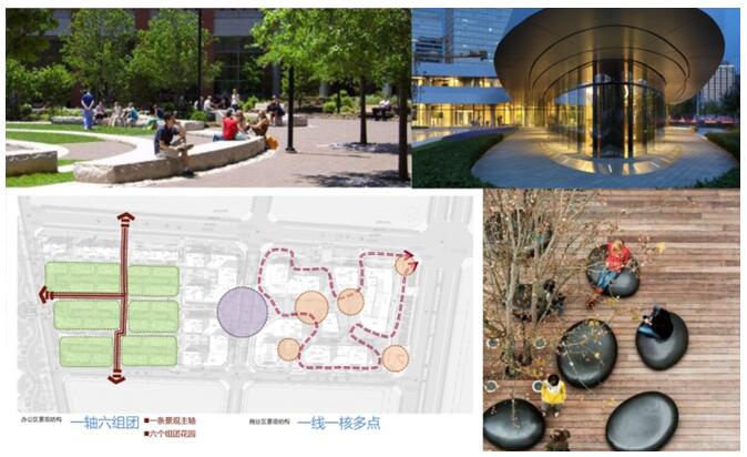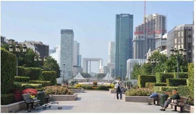 囊括通用电气、时代华纳、美联社等企业巨头的洛克菲勒中心,用建筑群中央的围合广场,打造了清新宜人的休闲景观。广场面积不大,微微下凹,中央伫立着金黄闪闪的普罗米修斯雕像。雕像下,是一个浮光耀眼的喷泉水池,酷暑季节水声叮咚,冬天又变成一个天然滑冰场,为广场聚集了大量的人气。广场周边,是各色咖啡吧和特色餐厅,由带状的街心花园隔离出露天经营的范围。街心花园内,时常举办各类艺术展览,下楼放松休闲的商务人士可自由穿梭。 法国巴黎拉德芳斯