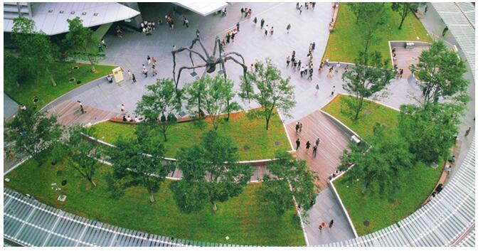 作为法国经济繁荣的象征,拉德芳斯在景观设计方面力求文化和新潮结合。街区景观以巨门为主轴线,取整个商务区的1/10为绿化用地,种植400余种植物。路面设计多用斜坡,水池和绿地交错点缀。水池底部,以多色地砖铺成纵向线条,透过水面细看,具有空间延伸的视觉效果。供路人休憩的长椅,往往设在树篱围合而成的下凹小广场内,在热闹的街区内开辟出一片安静的交际场所。 日本东京六本木