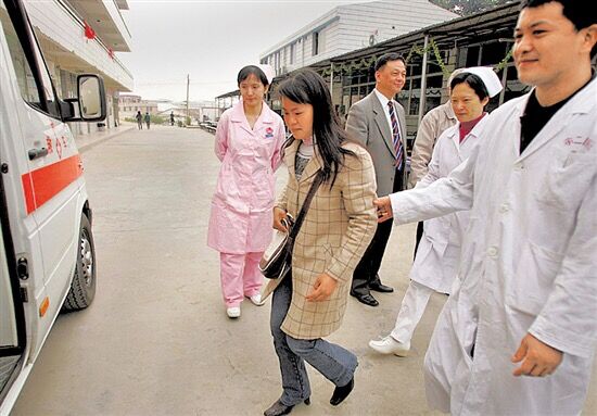洪招娣在医护人员的搀扶下,从岭南学院前往医院接受治疗