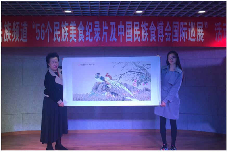 活动启动仪式上,中国美术家协会会员、中国女画家协会会员、著名国礼画家程香妤老师,特为这次活动赠送工笔画“金鸡鸿运”。画中山水代表水到渠成。梅花五瓣盛开代表,仁、义、礼、智、信。牡丹与金鸡寓意富贵大吉。祝贺央视微电影民族频道“56个民族美食纪录片及中国民族食博荟国际巡展”圆满成功!