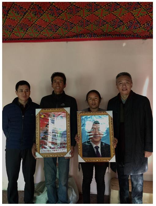 洪区长、王曦主任和正在摆放的庆祝西藏和平解放六十周年领袖照的藏族同胞合影