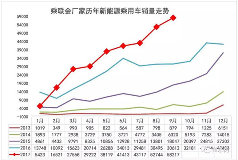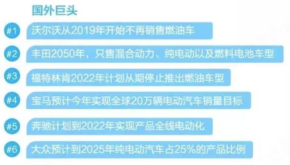 中外车企合资打造新能源汽车 根据乘联会数据,今年前9月新能源乘用车共销售312344辆,同比增长48% 一个重磅消息更证明了这一点,继法国、荷兰、英国、德国等欧洲国家提出停止销售燃油车计划后,2017中国汽车产业发展国际论坛上,工信部副部长辛国斌表示:“一些国家已经制订了停止生产销售传统能源汽车的时间表。目前工信部也启动了相关研究,也将会同相关部门制订我国的时间表,这些举措必将推动我国汽车产业发展的环境和动力发生深刻变化。”此前工信部曾发布《乘用车企业平均燃料消耗量与新能源汽车积分并行管理办法(征求意见稿)》(业内称之为双积分管理办法),推动中国新能源汽车产业的市场化步伐。