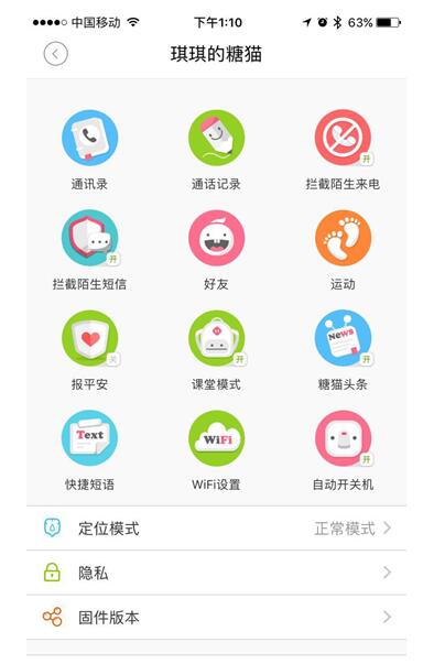 (照片普通效果,还可选择贴纸滤镜等) 人性设计家长模式 糖猫M2产品说明书上都会用一个单独的二维码,家长手机通过这个二维码,可以实 现与儿童手表的绑定,并通过糖猫APP来实现更多功能。以往儿童电话手表由于游戏等功能的加入,往往会影响孩子的学习,而糖猫APP的课堂模式能够远程控制手表进入一种类似于勿扰模式的状态,不但不能使用社交娱乐功能,电话通话等也会被禁用。安全方面,除了设置常用地点报平安以外,家长还可以设置拦截陌生来电,非常贴心。此外,家长还能掌握孩子的好友情况和通话记录,孩子的情况尽在掌握。