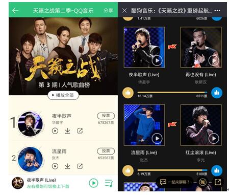 上期无人挑战的唱将华晨宇本期则对垒自称“这次已经鼓足勇气”的耿斯汉。再次致敬偶像张国荣的花花选择只保留最简单的钢琴来配乐烘托《夜半歌声》的浓郁情感氛围。歌曲目前在QQ音乐第3期人气歌曲榜以高达67万的票数稳居榜首,在酷狗星素歌曲PK列表中也获得了16万的超高人气。但与他对战的耿斯汉实力非常强劲,这位摇滚独行侠的一曲《再也没有》引爆现场,并以313票的高分赢得了胜利。