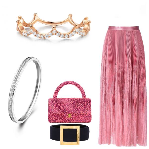 “玫瑰与诗”系列摩登风格“爱情心电”王冠戒指 “玫瑰与诗”系列摩登风格“傲秘”手环 搭配指南:摩登的聚会装扮离不开“闪烁”,一袭百褶亮色长裙搭配当下最流行的字母T, 再配上造型夸张的腰带,摩登又吸睛。闪烁的钻石圈提亮了T恤的酷,呼应了长裙的亮。 【优雅女神】 女神的优雅总是在一举一动中流露,哪怕是在八卦和吐槽中,优雅的姿态也不能少。