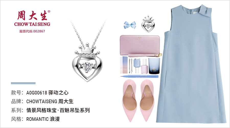 银色吊坠的纯净光芒与蓝色娃娃裙的恬静之美是公主纯净之心最好的外现。 搭配介绍:王冠与心形元素,增添了浪漫甜美的气息,心型中间的灵动设计,在颈间跳跃着闪烁的光芒。吊坠银色流光与冰淇淋蓝色娃娃裙的纯净,甜美相配。心形的造型上圆下尖,可以很好修饰脸型,粉色的尖头鞋又正好拉长了腿部比例。这套整体造型可以塑造出亭亭玉立,纯净甜美的公主风范。 《浪漫多情的心》 有着公主情怀的女生,她们的浪漫像一首诗,一件艺术品。她们巧妙地将浪漫的天性变为了对生活品质的追求。