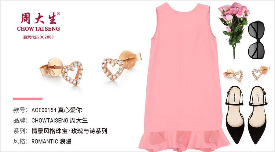 粉色的花瓣裙摆配上精巧的心形耳钉,浪漫精致的一天就这样开始了。 搭配介绍:可爱的心型造型的耳钉,可以修饰脸型,凸显优美的脸部弧线,让你在任何场合,都能自信地扬起公主骄傲的脸庞。简单明快的爱心耳钉,搭配浪漫活泼的花瓣裙摆,一动一静之间,粉色裙装映衬着娇美脸庞和粉嫩嘴唇,让你轻易俘获王子的真心。 《公主的活泼可爱》 有着公主情怀的女生,虽然向往着童话一般的生活,但她们不造作,不拘束,不脆弱,常常用明朗活泼的生活态度感染着身边的人。