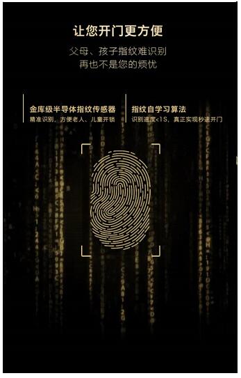 针对这个问题,目前名门指纹锁严格遵循国内防盗门的普遍规格,能够匹配市场上大部分门,基本避免发生购买后无法安装的情况。 核心3:指纹精准识别。其实,指纹锁最让人担心的,还是识别问题,作为高科技产品,如果指纹识别不灵敏,用户体验将是个灾难……所以,为了解决这个问题,名门指纹锁运用了指纹自学习算法,不断对比指纹图像,进行自我学习,更新指纹的特征变化,有效提升指纹解锁速度、识别率和灵敏度,识别速度小于1秒,即使面对老人、小孩和体力劳动者等指纹比较浅、指纹识别难度较大的特殊群体,名门指纹锁也能轻松识别,真正做到秒速开锁。