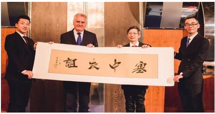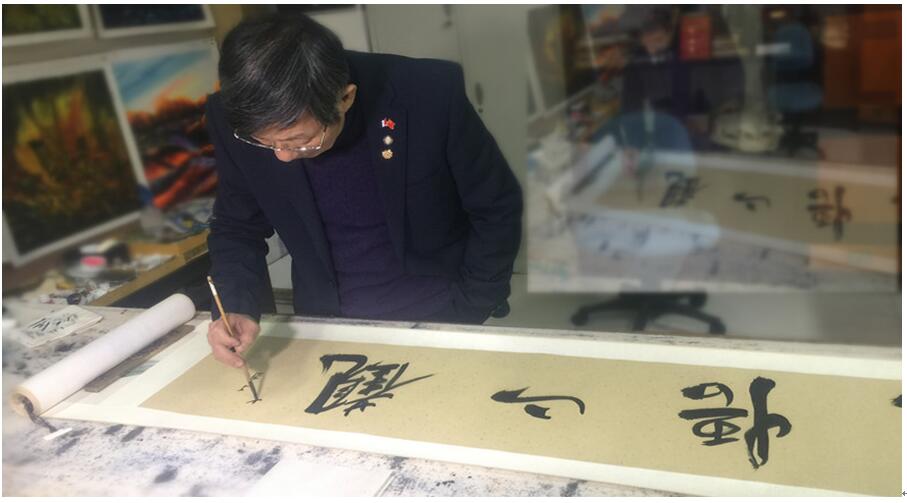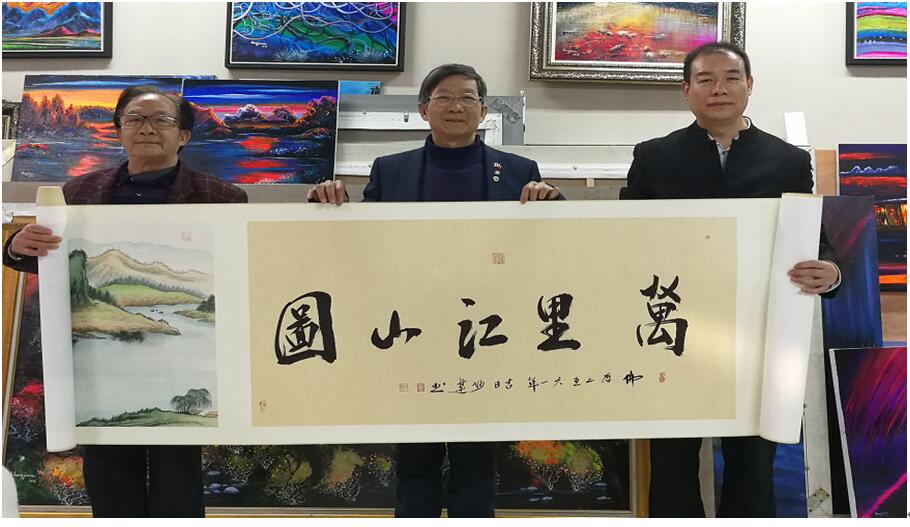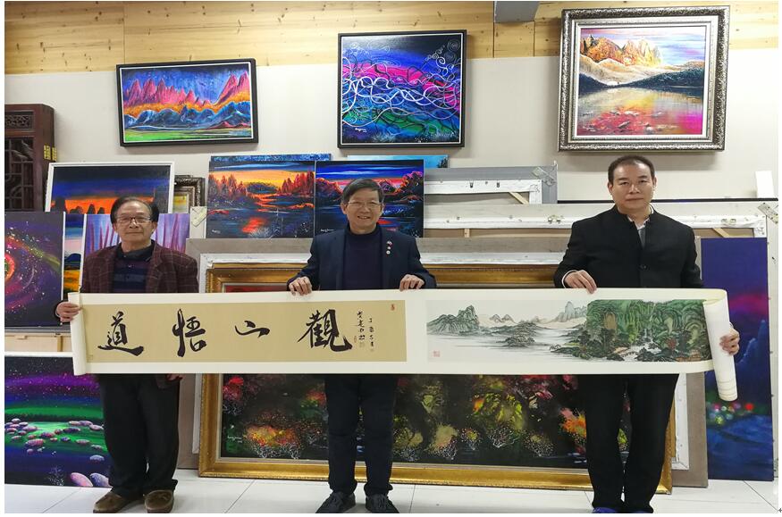 访谈结束后,黄建南先生为著名画家杨弘岳先生的长卷作品《清溪夏游》、《观山悟道》、《万里江山图》题字。黄建南先生对杨弘岳画家的作品高度赞赏:以自身的感悟感知,其画域甚广,山水画更是极具观赏收藏价值,达到了创新艺术与传统艺术的统一的完美结合。