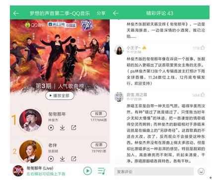 休战一期的《梦想的声音》第2季在上周五晚如约播出了第三期节目,导师和选手们极致的Live演绎,也为观众又奉上一场音乐盛宴。本期梦想的声音舞台上也首次出现导师同台,林俊杰与张靓颖的强强联合惊艳全场。作为节目的专享音频互动平台,腾讯音乐娱乐集团三大平台QQ音乐、酷狗音乐、酷我音乐也通过零时差专辑、人气歌曲榜、评论等多元玩法为乐迷们提供了“玩”综艺的阵地。