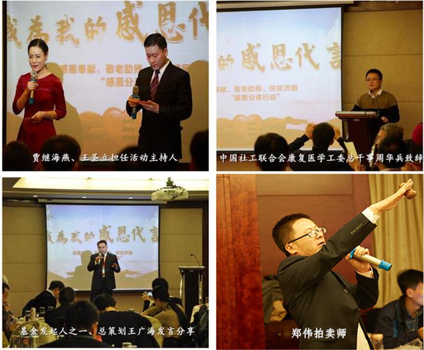 2017年11月19日下午,爱心点燃希望,拍卖传递真情,以“感恩奉献、敬老助残、扶贫济困”为主题的感恩分享活动在北京京泰龙国际大酒店三楼隆重举行。中国人民解放军国防大学毕泗振将军、国务院机关事务管理局服务局原局长石会民等嘉宾到会祝贺,著名书画艺术家杨弘岳、程香妤、柳佑平携作品参与本次公益活动;公益青年歌手石小飞、陈丽宇、李欣倩现场友情助演,相关部委老领导、专家学者、书画家、爱心企业家、公益人士等近百人参会。本次活动由民康感恩基金筹委会主办,北京欧耐特国际文化有限公司、拍拍在线(北京)拍卖有限公司和千年健酒业联合承办。惠圣堂(北京)医学研究院、贵州省仁怀市茅台镇老字号酿酒厂协办,引力传媒股份有限公司、山东英雄梦健身管理有限公司、北京鑫鑫诚信办公设备有限公司、福山缘茶文化生活馆(北京)有限公司赞助。