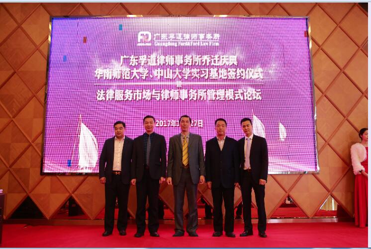 剪彩仪式之后,广东孚道律师事务所与华南师范大学法学院举行了关于共建实习基地的签约仪式。当日下午,中山大学法学院与广东孚道律师事务所就共建实习基地事宜达成意向,意向书签约仪式在广东孚道律师事务所进行。华南师范大学法学院党委杨晓生书记、中山大学法学院党委罗镇忠书记和副院长张亮教授分别出席了签约仪式。