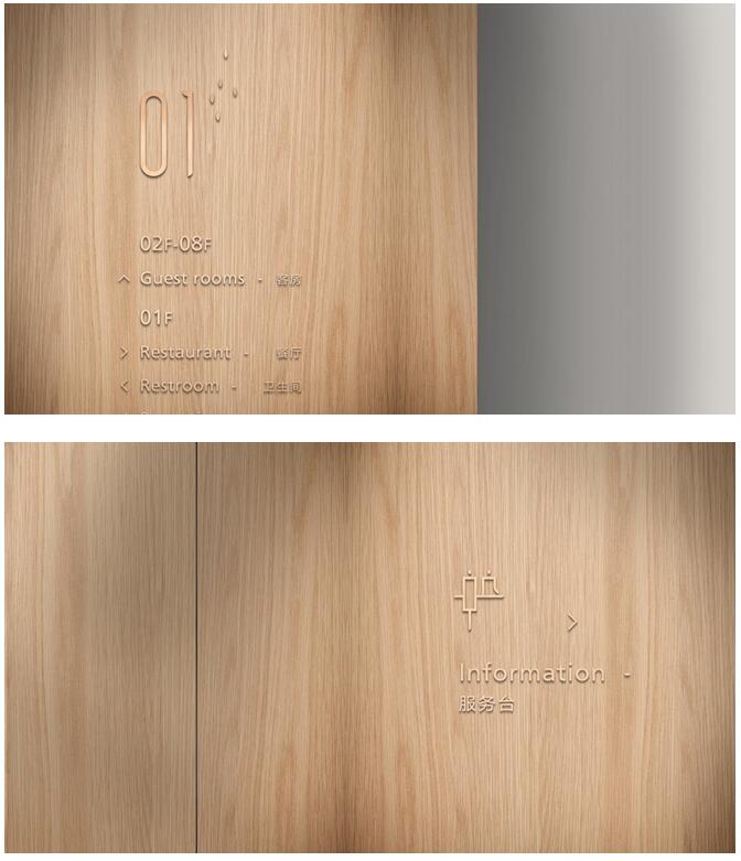 在酒店空间导视系统的形象设计上,麗枫采用创意的图标与中英文提示的结合,让导向更加清晰明确;同时提取木元素与黄铜色立体字相结合,表现出舒适自在空间感及追求生活质感。