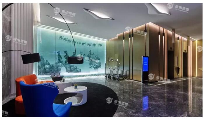 西安印力诺富特酒店,广田集团设计团队以“时尚、现代、商务”为该酒店设计的主要概念,将西安代表性的文化与艺术元素融入整个空间设计,打造出一个别具风情的时尚酒店。皮影戏是光与影的巧妙结合,广田集团设计师以其为创作的突破点,在纯净的背景上加入别具风情的皮影装饰图案与图腾,呈现出了一个具有独特视觉感受和艺术气质的现代酒店空间。同时,选取自然、生态的元素,艺术创作以蓝、紫、橙色为色彩为基调,在光影变幻中凸显空间的高贵、雅致。