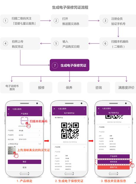 亚都“七星云”到底是什么? 这是亚都经过多年努力搭建成的一个优质售后服务平台,以诚挚、快捷、贴心、环保、透明、专业、尊贵七大核心要义为基础,旨在为用户带来七星级的服务体验。 当家里的净化器加湿器净水器等出现故障时,你是否曾为打不通售后电话而烦躁,你是否曾为缓慢的维修服务而苦恼,你是否曾为错综复杂的售后流程而闹心? 自2016年9月起,亚都正式全面启动“七星云”智能售后服务平台,只需在线报修、足不出户,自有工程师上门服务,迅速为你解决机器故障。可以说,亚都“七星云”,生来就是为你解决售后维修的烦恼,且在你购买亚都产品的那一刹那,便能尊享。 流程明晰,操作简单,方便快捷,一旦产品发生故障,你只需完成以下步骤,便能享受这种七星级的售后服务体验。 第一步:生成电子保修凭证 当你购买亚都的产品时,你只需微信关注“亚都七星云服务”公众号,完成注册,绑定你购买的产品,上传购买凭证、填写购买时间以及购买渠道,完善信息,系统便会自动生成电子保修凭证,流程如下: