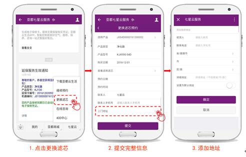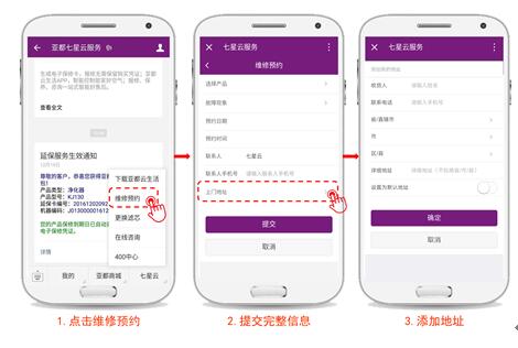 当你家里的净化器或其他产品发生故障时,你可以在七星云平台上点击维修预约服务,同样,只需提交相关信息,足不出户,自有专业工程师上门维修。