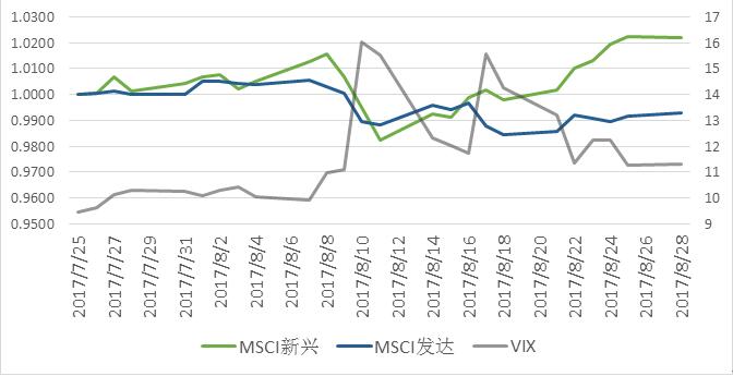 随着全球风险来源重心的迁移,各类资产间原本稳定的相关性和交易定式可能即将遭遇考验,8月接下来的两周,各个市场的走势就已经画风突变。全球风险指数上行,但新兴市场却在震荡上涨;被认为具有避险属性的美元不涨反跌,而人民币反而表现的像避险货币;代表避险情绪的金价在向上突破,同时代表增长预期的铜价却也在稳步上行……这些价格波动貌似杂乱又矛盾,但我们始终相信:Everything is connected,事物纷乱的表象之下必然都有紧密的内在联系。 一、 8月以来全球市场“画风突变” 为什么说全球市场近期画风突变?首先我们看到风险事件冲击对新兴市场与发达市场股票的影响已经不同于多年来形成的模式。8月以来随着川普两次“嘴炮”——一次威胁朝鲜,一次威胁关闭政府——大幅抬升风险指数VIX,但随后我们看到新兴市场股指从震荡中快速恢复,到月末已经全部收复失地并大幅跑赢发达市场。