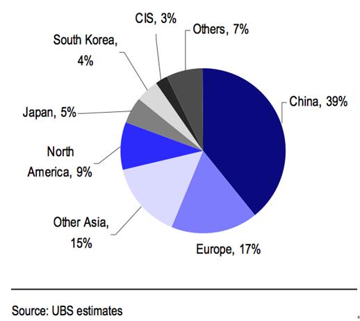 图表 5:铜被广泛用于各类生产活动中 接下来我们再看一下铜的需求结构。铜的需求主要集中在非美地区特别是中国,欧洲和亚太,北美地区由于长期制造业空心化,铜需求的全球占比已经低于10%。