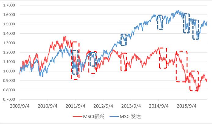 图表 1:8月市场动荡中新兴市场不断上扬 来源: MSCI, Wind, 歌斐资产创新研究部 这种运动模式可以说相当罕见。多年来大家已经习惯的市场规律是(如下图所示),在风险事件冲击中,新兴市场回撤幅度总是要比发达市场大得多,并且恢复少,最终结果是不断跑输发达市场。