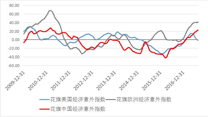 图表 6:中国欧洲和新兴市场构成铜的绝大部分需求 最后我们再看一下中美欧三地的增长预期对比。如果以花旗经济意外指数作为代理指标跟踪,可以看到,中国和欧洲地区的增长预期已经摆脱了多年以来落后美国的局面,目前仍在向上,而美国的经济数据则连续不及预期,增长预期反而开始向下。
