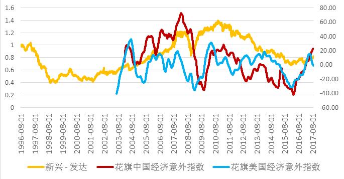 图表 9:新兴市场相对收益来源:全球增长向上 来源:MSCI,Wind, 歌斐资产创新研究部 •相对收益来源二:增长预期此长彼消 中美经济的相对增长预期也解释了新兴与发达的相对收益曲线。下图我们把花旗意外指数拉到指标起点2003年,可以看出在上一轮强势周期01~07年中,中国的增长预期高于美国,而在弱势周期2010~2016年中,则低于美国。当前,中国增长预期已经重新赶超。