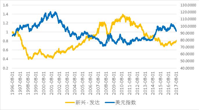 图表 10:新兴市场相对收益来源:中国的相对增长 来源:MSCI,Wind, 歌斐资产创新研究部 •相对收益来源三:资金争夺处于上风 全球资本在新兴与发达市场间的流入和流出也是新兴市场相对收益波动的因素。用美元指数是观察资金进出美国的有效指标,长期与新兴市场相对收益曲线形成负相关。从2011年美元指数的低点73作为起点,到今年年初103的位置已经走过了7年的强势周期。目前美元顶部回落特征明显,新兴市场在全球资金争夺中再次处于上风。