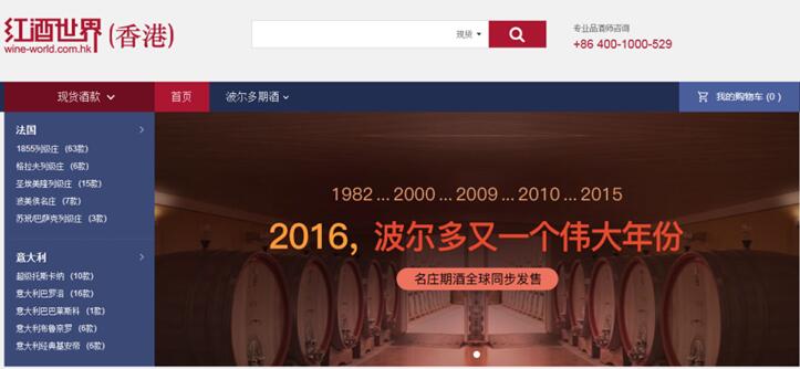 红酒世界电商(香港)有限公司 2016年11月,红酒世界电商(香港)有限公司正式上线运营红酒世界香港网上商城(www.wine-world.com.hk)。目前,红酒世界香港商城主要提供法国波尔多、苏玳和意大利托斯卡纳、巴罗洛、布鲁奈罗等著名产区的葡萄酒共183款,2016年的波尔多名庄期酒94款,其中包括2009年拉菲古堡红葡萄酒、2009年木桐酒庄红葡萄酒、2000年拉图城堡红葡萄酒等众多顶级名庄的优秀年份葡萄酒。