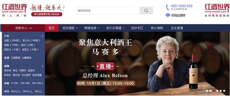 红酒世界是一家以葡萄酒资讯自媒体起步的电商企业,主要从事进口国际知名原产地葡萄酒的线上线下销售。2012年9月,红酒世界以先发优势创建了红酒世界网(网址:http:// www.wine-world.com/),并在短短两年间成为国内领先的葡萄酒资讯自媒体。2014年11月,红酒世界正式上线运营红酒世界网上商城(网址:http:// mall.wine-world.com/),开始了葡萄酒资讯自媒体向“自媒体+电商”的跨步。2015年12月8日,红酒世界在全国中小企业股份转让系统(“新三板”)实现正式挂牌交易,股票名称为“红酒世界”,股票代码为“834528”。创立至今,红酒世界已经成为葡萄酒领域颇有影响力的电商企业之一。