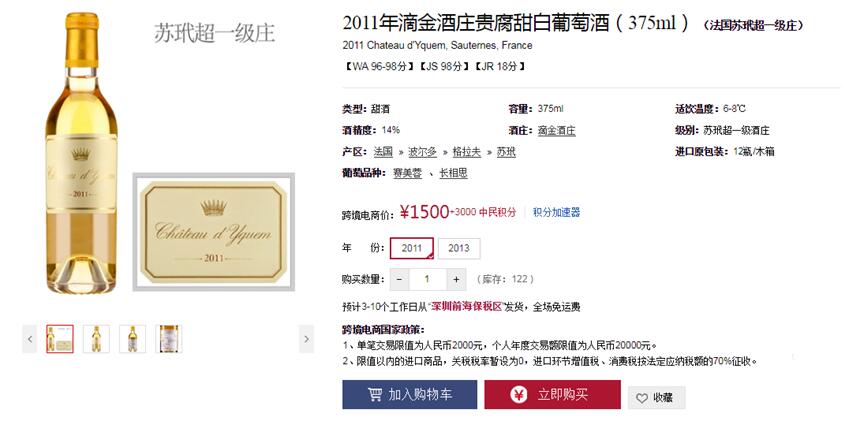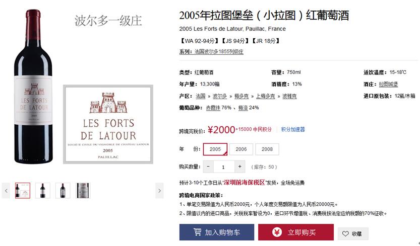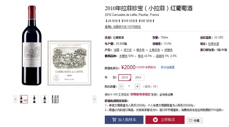 财政部、海关总署和国家税务总局联合发布《关于跨境电子商务零售进口税收政策的通知》(简称“新政”),规定国内消费者在跨境电子商务网站上单次交易限值为人民币2,000元,个人年度交易限值为人民币20,000元。在限值以内进口的跨境电子商务零售进口商品,关税税率暂设为0%;进口环节增值税、消费税暂按法定应纳税额的70%征收。这也就意味着消费者购买限值以内的进口葡萄酒,可享受0关税的优惠政策。目前红酒世界跨境电商的定价为含税价,即消费者拿到手的价格。 红酒世界跨境电商已经上线300多款酒款,涵盖法国、意大利、美国和智利等国家,其中包括波尔多、勃艮第、托斯卡纳和纳帕谷等经典葡萄酒产区,包括2013年柏菲酒庄红葡萄酒、2005年拉图堡垒(小拉图)红葡萄酒、2010年拉菲珍宝(小拉菲)红葡萄酒、2008年美讯酒庄红葡萄酒等全球名庄葡萄酒。所有的酒款均由红酒世界专业团队从各国原产地直采,精心挑选,从国外原产地采购集中运输至深圳前海恒温恒湿保税仓,从深圳前海保税仓库直接发货,全程由海关监管。未来,红酒世界跨境电商还将继续上线更多知名酒款。