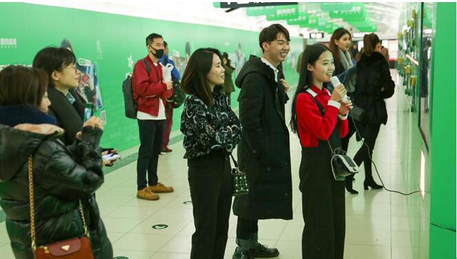 红衣小姐姐人美歌甜,引得大伙儿驻足,身后的小哥哥露出了灿烂的笑容~ 白色的麦克风和有趣的标签吸引着乘客们跃跃欲试,小男生走到LED屏下拿起麦克风一展歌喉,你认真唱歌的样子真可爱~