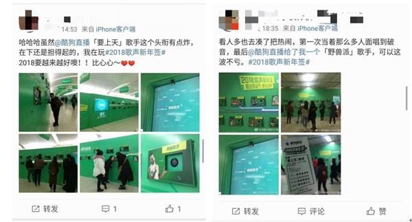 在#2018歌声新年签#互动装置上,各种歌手的关键字云也在LED 屏幕上缓缓转动,吸引了大批的乘客的关注,个性的标签、智能的灯光指引、有趣的占卜体验,这可以说是继“酷狗音乐,就是歌多”之后的又一次大规模年轻人的狂欢。
