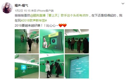 你站在屏幕前拿着麦克风对准屏幕唱一首歌,屏幕将测算出你是哪种“歌手”,灯带会引导你走向特定的「歌手新年签」喇叭,并播放该类型歌手的对应歌曲,系统还会打印出纸质版新年签,上面附有对应歌词、2018全年趣味运势等,很多网友把这些有趣的内容也分享到了微博上。