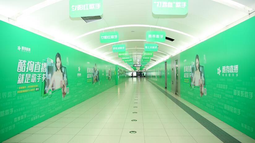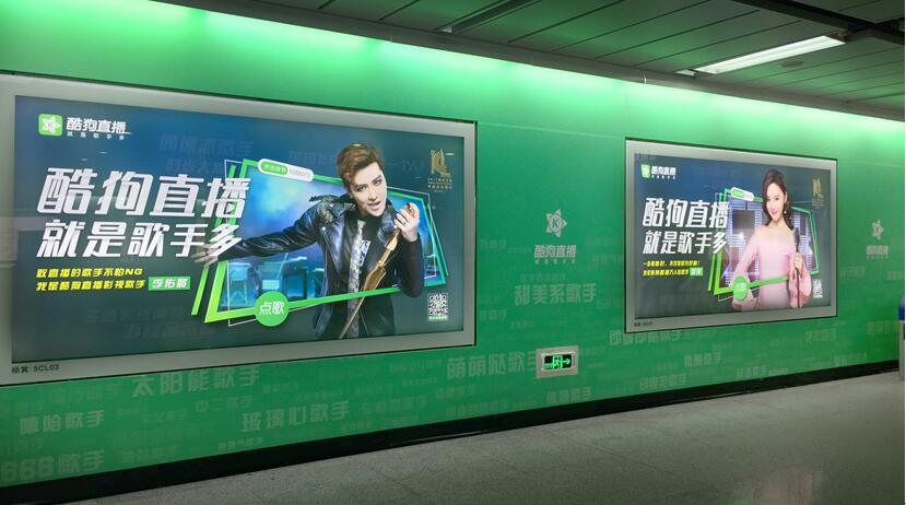 一走入地铁站,不同于以往的沉闷,一股充满清新能量的绿色扑面而来,配合着墙贴上各种新奇有趣的歌手标签,太阳能歌手、666歌手、甜美系歌手……让人情不自禁对号入座,浮想联翩。与此同时,7幅巨幅海报映入眼帘,有高颜值的女神范、嘻哈范、暖男小鲜肉等,配上朗朗上口的“酷狗直播,就是歌手多”,让人记忆深刻,也直呼“太养眼”。