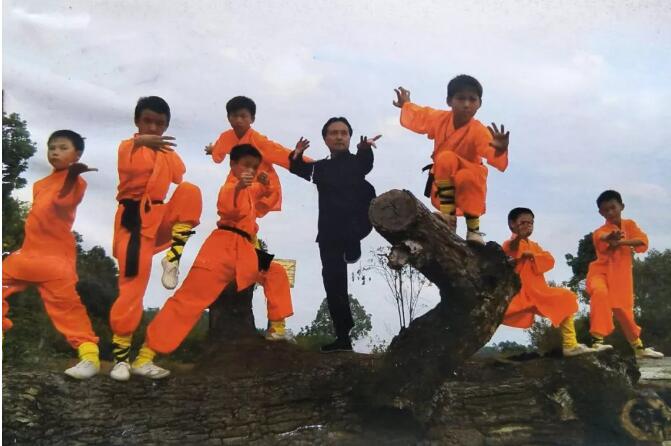 邱教头非常珍惜这次难得的机会,学习、操练非常用功刻苦,有幸得到了王成法老师的悉心点拨和指教。 就是在王教练东门培训结束后,邱教头还随王教练在大瑶的老家住了两个多月,白天帮他家打禾做家务等,有空时就切磋武艺。这样一来,邱教头收获蛮大。 捉襟见肘的家境,父亲不惜卖口粮、换学费送他学艺的情景,在邱教头的心中打下了深深的烙印。年幼的他比同龄人成熟、懂事得更早。 在他幼小的心灵深处,从此立下定要改变困境、毕生崇文尚武的宏大誓言,坚定了邱教头要做一名职业武术人,将武术当事业做的远大理想。 03 1986年,年仅18岁,刚刚高中毕业离开校门的邱教头,就在风景秀丽的大围山下大溪河畔办起了振龙武馆,开启了人生的第一次转折,迈出了从学武者到授武者转变的第一步。 坚持了两年后,市里公安局成立首家保安公司,聘请20岁刚出头的邱教头担任武术总教练。 随着保安市场的开放,民办保安公司也应运而生。做生意出身的北盛乌龙人张老板也成立了猎豹保安培训中心,不惜花重金挖了公安局保安公司的“墙脚”,把邱教头请去当武教头。 尽管当时已是名动一方的武教头了,但邱教头深知自己经历的系统和专业训练太少,做职业武术人的理论功底不深。 看到自己的差距后,邱教头毅然决然地谢绝了多家保安公司和武术培训学校的高薪聘请、执意挽留,背上简单行囊北上河南嵩山少林寺,一学就是两年。 3.习武留影