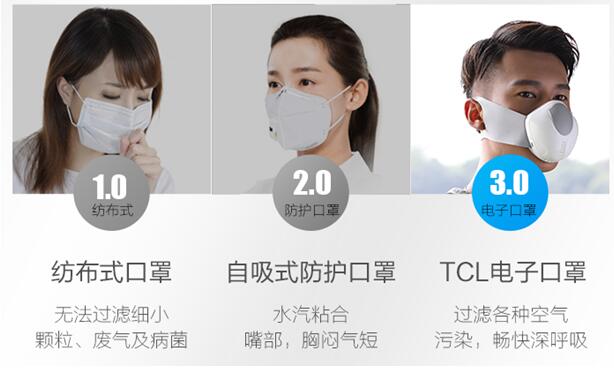 穿戴式空气净化器与大家常用的口罩有什么区别?纵观市面上的口罩产品,一般是无纺布式口罩、纱布口罩,材料劣质,结构不严谨,不但无法阻挡PM2.5等细小颗粒和废气、病菌,而且不透气,佩戴不舒适,容易造成呼吸阻力,存在健康隐患。TCL创新推出的穿戴式空气净化器也被称为“电子口罩”,从过滤功能到使用舒适感上都以专业技术带来颠覆性体验,其研发的“主动送风”技术,更有效解决目前口罩行业的痛点,实现消费者佩戴口罩也能畅快呼吸。