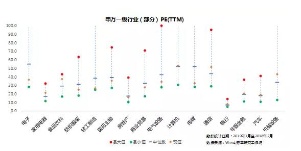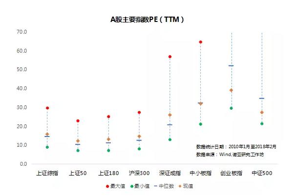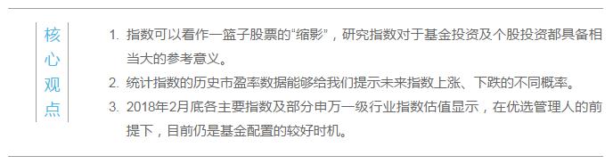 我们知道指数是股市的“晴雨表”,投资者可以根据指数的涨跌来对市场的整体状况做一判断,虽然指数涨跌与个股涨跌并非完全对应,但是从整体角度、趋势角度来看,研究指数对于基金投资及个股投资都具备相当大的参考意义。 那么,我们能够采取什么办法来评估指数到底是高估还是低估,进而指导实际投资呢? 在分析一只个股时,我们经常采用市盈率(PE)、市净率(PB)等常见指标来对股票进行估值,也就是通过计算各项数据来估算出投资标的价值,然后以此为参照物判断标的现价的高低,进而进行买入或卖出操作。那么指数是否可以采用这种方式来进行估值呢? 我们认为是可以的,其原因在于:从指数的构成角度来讲,指数是按照不同规则选取有代表性的一组股票,按照一定的方法对他们的价格进行计算,用来描述这一组股票整体价格水平的变化。 比如说2017年大出风头的上证50指数,它就是以上海证券市场上规模最大、流动性最好、最具代表性的50只股票作为样本股进而编制而成的成分股指数。通过观测上证50指数的涨跌就能够快速了解该指数背后50只股票整体的价格涨跌情况。 从这一角度来看,指数可以看作一篮子股票的“缩影”,使用市盈率估值法有其合理之处。 知道了估值的方法后,我们是否可以通过分析历史数据来判断指数处于高估还是低估状态呢? 这个问题其实是没有确切答案的,任何采用历史数据来预测未来的行为都存在局限性,但是分析统计数据却能够给我们提示不同事件的发生概率。假如股票市场是一条河流,那么指数的历史估值就如同水文记录。有了估值这把标尺,我们可以清楚地知道水位的高低。为此,我们统计了2010年1月以来A股主要指数及主要申万行业指数(一级)的PE(TTM)的波动范围,来判断当前市盈率处于历史市盈率波动范围的哪个位置。