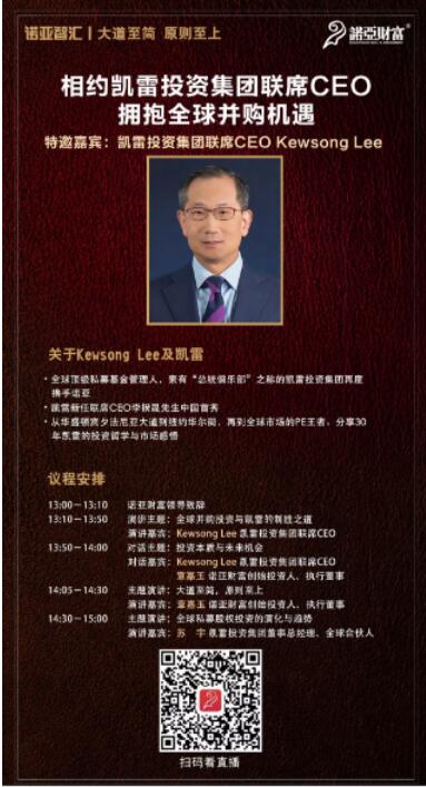 (扫码看直播) 【关于Kewsong Lee及凯雷】 * 全球顶级私募基金管理人,素有“总统俱乐部”之称的凯雷投资集团再度携手诺亚。 * 凯雷新任联席CEO 李揆晟先生中国首秀。 * 从华盛顿宾夕法尼亚大道到纽约华尔街,再到全球市场的PE王者,分享三十年凯雷的投资哲学与市场感悟。 在全球私募界,凯雷的标签是“投资界的总统俱乐部”, 凯雷创始人鲁宾斯坦,曾是卡特政府的政策顾问,和政府的良好关系为凯雷的早期发展带来很大帮助。 正如另一位创始人Dan D’Aniello在接受媒体采访时所说的那样,“凯雷早期通过引进一些具有战略眼光的专家解决了发展问题”。 这些专家多有强大的政府背景。比如里根时代的国防部长弗兰克•卡鲁奇(Frank Carlucci)曾在1990年代担任过凯雷董事长,前总统乔治·布什、英国前首相约翰·梅杰等都为凯雷工作过。 在创始人团队的带领下,凯雷逐渐成长为以企业并购、杠杆融资、房地产等多元化业务为中心的私募股权公司,且核心行业拓展至能源、科技、消费品、金融、运输等方方面面,投资案例包括租车公司Hertz Global Holdings Inc、图像公司Getty Images Inc和耳机制造商Beats Electronics LLC等。 2017年8月,凯雷投资还联合中信股份和中信资本完成了与麦当劳中国(已经更名为“金拱门”)战略合作的交割。 截至2017年9月30日,凯雷的资产管理规模为1740亿美元,拥有306个投资基金。其中,凯雷的亚洲私募股权投资平台在区内的股本投资规模超过147亿美元,资产管理规模达116亿美元。 |