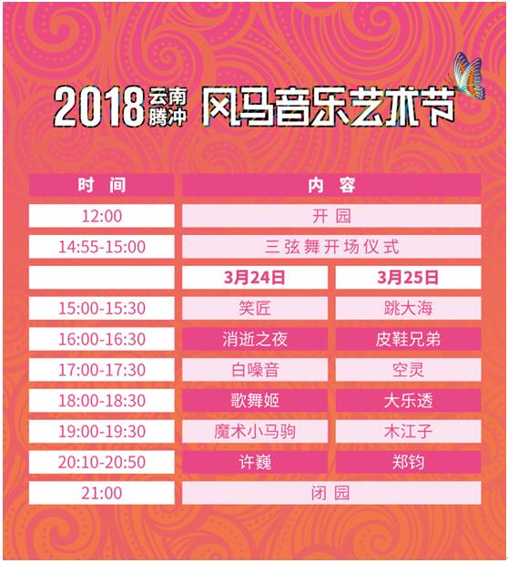 2018年云南腾冲风马音乐节演出时间表 3月24日 15:00—15:30 笑匠乐队 16:00—16:30 消逝之夜乐队 17:00—17:30 白噪音乐队 18:00—18:30 歌舞姬乐队 19:00—19:30 魔术小马驹乐队 20:10—20:50 许巍 3月25日 15:00—15:30 跳大海乐队 16:00—16:30 皮鞋兄弟乐队 17:00—17:30 空灵乐队 18:00—18:30 大乐透乐队 19:00—19:30 木江子乐队 20:10—20:50 郑钧 票务信息 预售单日票:130元 预售两日通票:230元 现场单日票:160元 大麦网/秀动网现已开售 |