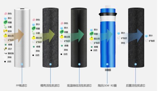 以净水领域的实力品牌——TCL的反渗透净水器TJ-CRO515A-5为例,该产品采用美国进口陶氏RO膜,过滤精度高达0.0001微米,五级深度反渗透净化系统,层层过滤,强力去除细菌、病毒、小分子有机物、重金属等各种有害物质,是优质反渗透净水器中的代表性产品。