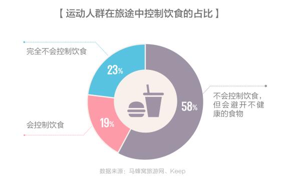 数据也显示,仅有 19% 的人会在旅途中也控制饮食,另外 58% 的人会尽量避开像油炸食品、甜品等不健康的食物,剩下 23% 的人认为美食是旅行的一部分,坚持运动也绝不能错过美食。