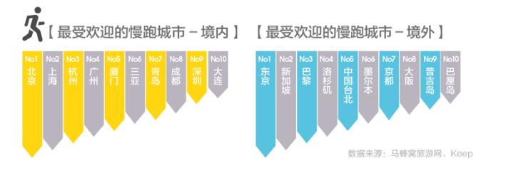 旅行中要求运动项目没有太高的装备和场地要求,最好还能游玩健身两不误,因此行走和跑步是旅途中最受欢迎的运动方式。 最受欢迎的境内慢跑城市是北京、上海、杭州、广州,境外最受欢迎的慢跑城市则是东京、新加坡、巴黎、洛杉矶。统计发现,人们在目的地日均跑步 40 分钟,平均消耗 365 千卡。