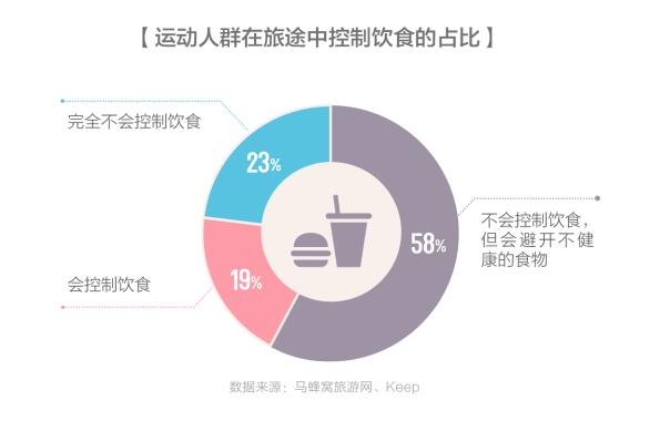数据也显示,仅有 19% 的人会在旅途中也控制饮食,另外 58% 的人会尽量避开像油炸食品、甜品等不健康的食物,剩下 23% 的人认为美食是旅行的一部分,坚持运动也绝不能错过美食。