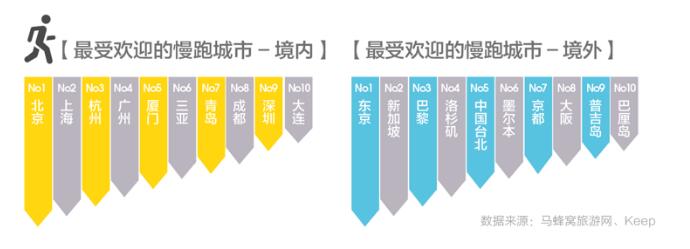 最受欢迎的境内慢跑城市是北京、上海、杭州、广州,境外最受欢迎的慢跑城市则是东京、新加坡、巴黎、洛杉矶。统计发现,人们在目的地日均跑步 40 分钟,平均消耗 365 千卡。