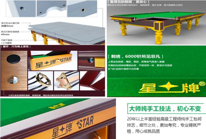 2018年全国两会政府工作报告指出,加快制造强国建设,全面开展质量提升行动,推进与国际先进水平对标达标,弘扬工匠精神,来一场中国制造的品质革命。 星牌31年来一直遵循大师精神,就是热爱你所做的事胜过这些事给你带来的钱,专注、严谨、耐心、精雕细琢、追求完美、淡泊名利。在台球桌方面,星牌通过科技、工艺、人才、设备、材料等五位一体的品质体系,保证产品精准、稳定、标准、耐用。 以世界职业斯诺克比赛专用台XW101-12S为例,星牌自主研发了第二代自动恒温加热除湿系统,使全台温度均衡如一,有力保证台球精准走位。