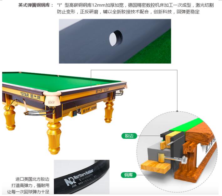 “I”型高碳钢钢库12mm加厚加宽,德国精密数控机床加工一次成型,激光切割防止变形,正反研磨,辅以全新胶接技术配合,全球首创,回弹更稳定;世界职业斯诺克协会授权唯一标准袋口模具,手工现场核准,严苛到毫米。