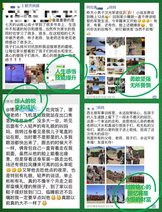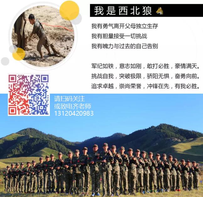 绿色无污染的食物 而在这样严酷的训练里,营地的餐食却是营员们的最期待的,绿色无污染的食物、甘甜的山泉水,每天的蓝天白云、日出日落、夏日的星空都会让大家看得痴迷。 标准安全的训练体系,专业的教练团队 中国最早一批从事儿童户外生存训练的专家,连续20年专注相关领域的课程开发和实施;儿童心理学专家:中国科学院心理研究所,美国Michigan State University毕业;经验丰富的军事教官团队:部队服役4年以上和现役军人,接受过专业青少年教育培训;环境治理专家、公益先驱:最早扎根西北,坚持治理荒漠化20年。 我们精心为孩子成长设计的重要一课——“西北狼野战军事夏令营”,2018年正在招募新兵。 【参军要求】 参军时间: 第一期:2018年7月15日-7月24日 第二期:2018年7月27日-8月5日 第三期:2018年8月8日-8月17日 营地位置:甘肃武威 集合地点:各地乘机或乘坐火车的营员于兰州中川国际机场集合,各地包车团队于西北狼营地集合 入营须知: 1、7岁以上,能独立作息,身体健康,无先天性疾病或遗传病史之少年均可报名。 2、家长(监护人)签署安全协议, 24小时联系电话及紧急呼叫备用电话随时开机; 3、新兵入营档案填写完整,档案内容完全保密,学员档案永久存档。(文章左下角) 4、结营颁发毕业证书及荣誉勋章。 5、营员单独来参加,请根据集合时间预定乘车或乘机时间,并提前4天左右告知营员所乘坐火车列次及车厢号或者航班号。如需派专人前往营员出发地带队或安排专人专车接站(机),将根据实际产生金额收取相应费用。 携带物品: 1、个人生活用品(洗漱洗浴用品、运动鞋、拖鞋、裤腰带、便装、内衣、袜子、纸巾、个人药品等) 2、有特长的学员可以携带工具入营,如乐器,表演服装等 3、假期作业或文化书籍 严禁携带:电子产品、现金、零食、贵重物品、刀具等危险物品,手机入营后统一交由辅导员保管。 |