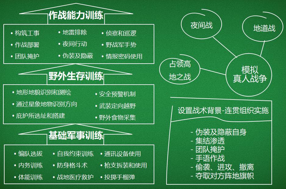 恶劣的气候环境 这里白天烈日的暴晒、夜间的寒冷、雨天的难熬,都为西北狼野战军事营的训练增加了更多难度。 严苛的训练课程 孩子们不但要亲自搭建营房帐篷,打扫营房,轮流去菜地收集食物、当帮厨,还必须掌握20多项专业军事技能,进行野战军实战演习、野外生存训练和环保教育。