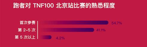 2017年,Keep首次与TNF100合作,不仅为用户争取到了非常珍贵有限的参赛资格,而且邀请户外运动健身大牛、原海军陆战队成员Ruben Payan Jr担任课程总监打造了一系列适合越野跑者的线上训练课程,向众多健身爱好者传播TNF100的越野魅力。今年,Keep继续创新,首次将TNF100赛事搬到线上,将语音剧情跑和跑步收集徽章碎片相结合,将技术与人文有机融合到赛事中让人眼前一亮,吸引更多普通跑者能了解、体会越野跑的精彩。 二、参赛者大多是TNF100“菜鸟”,但绝对是跑步“老鸟” 从参加TNF100北京站赛事次数的角度看,本届比赛大多数参赛者都可以说是菜鸟新手。有5次以上参赛经历的仅有4.2%,其余95.8% 的参赛选手均没有丰富的参赛经验,而且超过54%的选手是首次参赛。