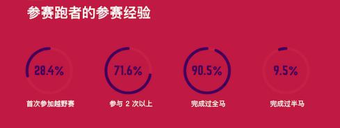 但另一项数据显示,他们绝对是跑步老鸟。参赛者中完成过全程马拉松赛程的比例达到90.5%,剩下不到10%的选手则全部完成过半马,可以说百分之百均是准马拉松专业选手。同时参加2次以上其他越野赛事的比例达到了71.6%,接近四分之三。